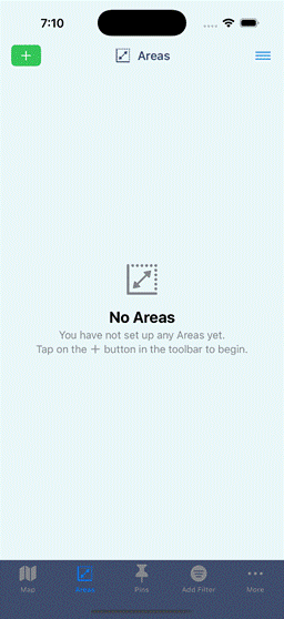 Areas view lists all Areas that have been created. Initially there will be no defined areas. Tap