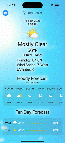 weather view displays the weather for the pin location. The view shows the current weather, an