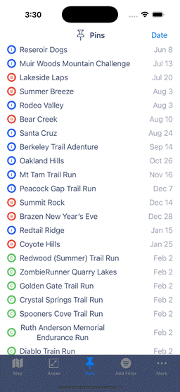 default, the event date for each pin is included in the list. To change this, tap on the date then select
