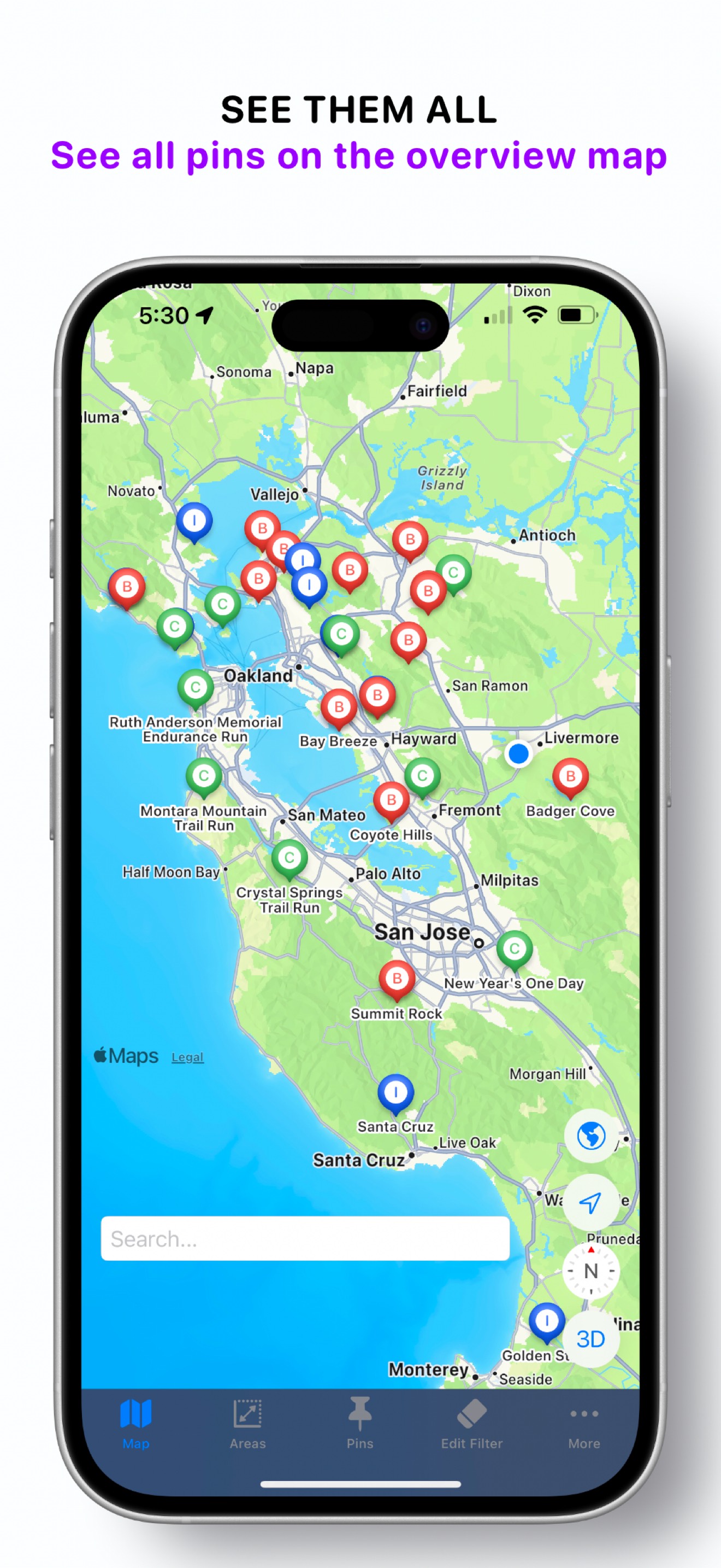 List all your Pins, or filter them by Area for quick access. Never lose track of your important locations.